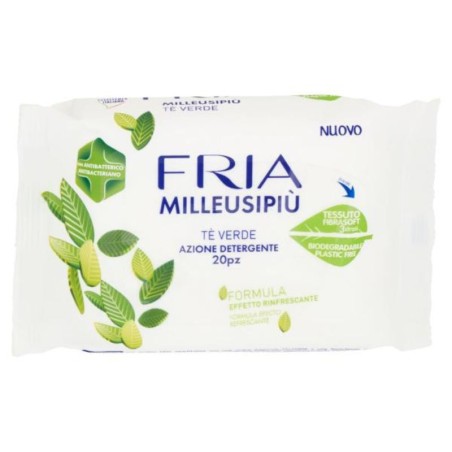 Nuova profumazione al TE’ VERDE e formulazione con ANTIBATTERICO ad effetto RINFRESCANTE, per le salviette FRIA MILLEUSIPIÙ.Queste salviette svolgono un’azione di detersione dell’epidermide senza irritarla. Ideali fuori casa e particolarmente comode in tutte le situazioni in cui si richiede una detersione facile e veloce, senza risciacquo.Rendono la pelle morbida e fresca senza ungere.